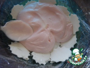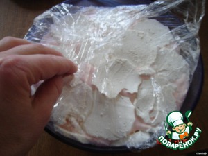 Выстилаем форму пищевой плёнкой и начинаем выкладывать слои.