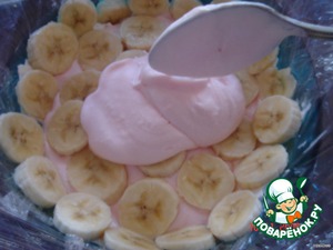 Взбить сливки и добавить уже готовый желатин, за счёт вишнёвого желе сливки получатся розового цвета.