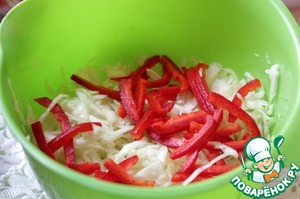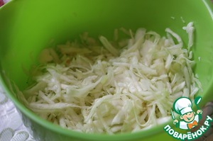 Капусту нашинковать, приправить белым перцем, парой щепоток соли и сахара, немного помять руками.