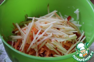 Добавить яблоко, нарезанное соломкой и сбрызнутое лимонным соком.