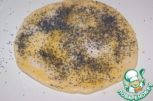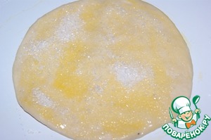 Раскатать узелок в лепешку приблизительно 12 см в диаметре. Тесто настолько нежное и послушное, что я расправляла его руками.