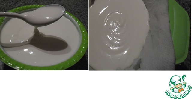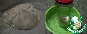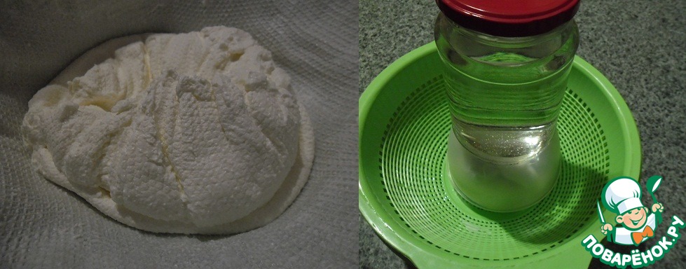 Оставьте на часок, сыворотка стечёт и удобнее будет свернуть салфетку конвертиком. Немного приподняв салфетку, ещё очень мягкий сыр собираем в комочек, накрываем массу краями салфетки, сверху блюдце и груз ( я вложила плотно в лоток вверх дном). Всё, как обычно делаем сыр или творог. Оставить на ночь.