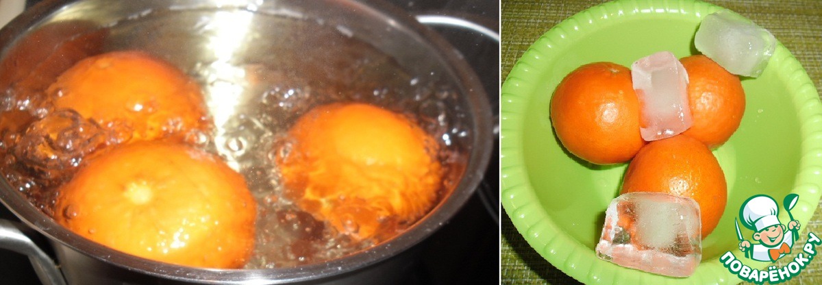 Мандарины опустить в кипяток и варить 10 минут. Вынуть, охладить.