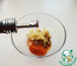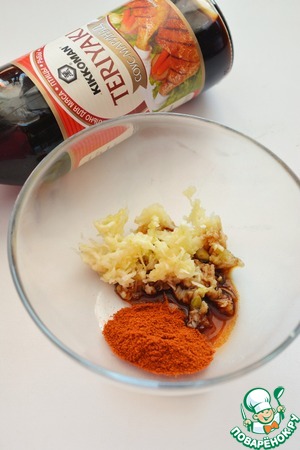 Для маринада измельчите через пресс чеснок, добавьте паприку, мускатный орех и соус Терияки "Киккоман"