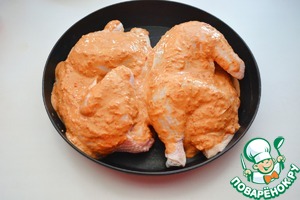 Цыплёнка разрежьте на половинки, промойте под водой, обсушите салфеткой. Натрите со всех сторон солью и сбрызните лимонным соком. Оставьте при комнатной температуре на 1 час, чтобы корочка слегка подсохла.