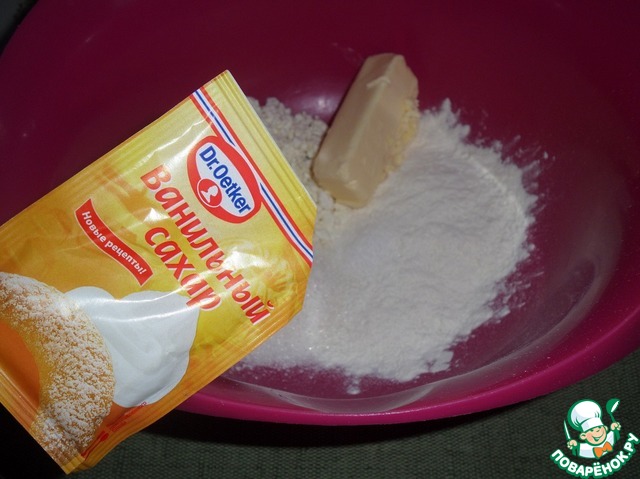 В чашку просеиваем муку. Добавляем творог, сахар, сливочное масло. Добавляем ванильный сахар ТМ "Dr.Oetker".