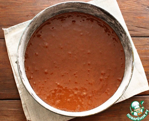 В подготовленную форму выливаем тесто, разравниваем. Чтобы тесто равномерно распределилось, форму можно несколько раз прокрутить. Ставим форму в заранее разогретую до 180 С духовку на 25-30 минут. Готовый корж проверяем на сухую шпажку.