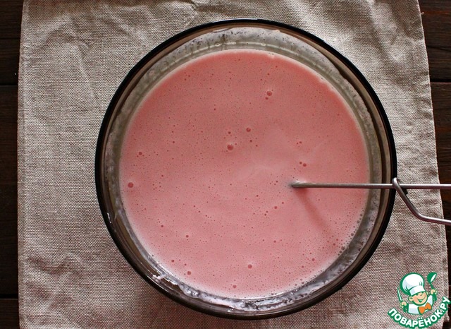 Добавляем сахар по вкусу и оставшиеся 290 г йогурта, перемешиваем, получается жидкая масса. Переливаем ее в емкость, в которой будем взбивать и убираем в холодильник. Пока масса из йогурта будет стоять в холодильнике необходимо несколько раз перемешать ее, т. к. около стенок йогурт желируется быстрее.