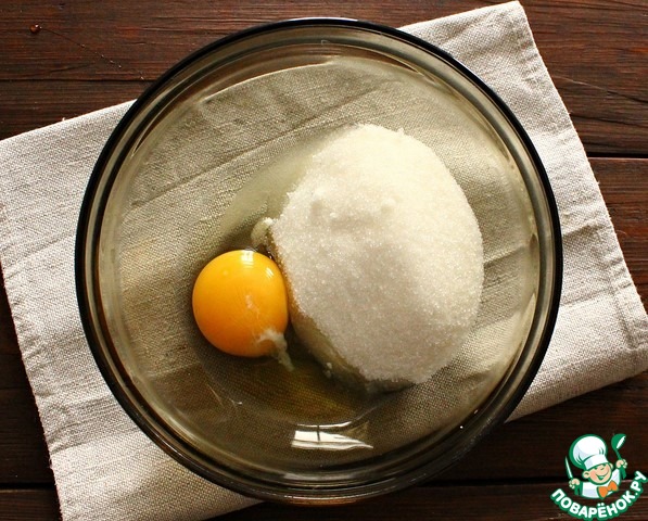 В миску с сахаром вбиваем яйцо и миксером взбиваем в пышную массу. Взбиваем недолго, примерно 1 минуту.