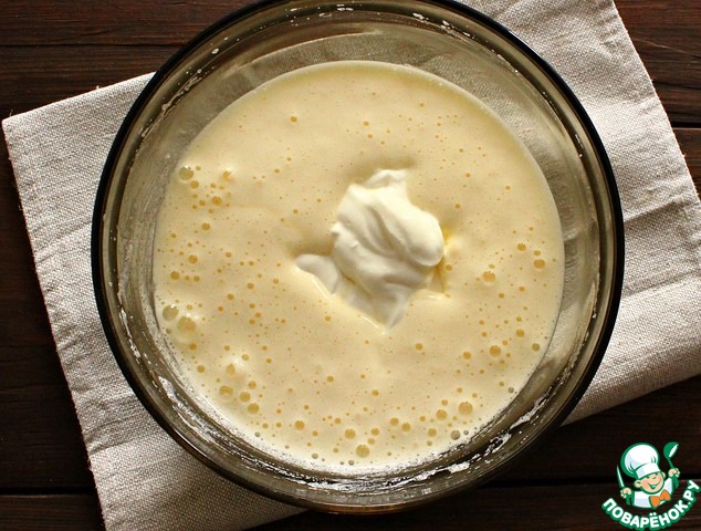 Во взбитую массу добавляем сметану и еще раз взбиваем миксером в течении 1-2 минут.