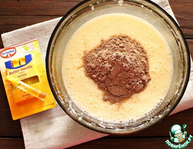 Добавляем 1-2 капли пищевого ароматизатора (по желанию) и всыпаем сухие ингредиенты. Перемешиваем на минимальных оборотах миксером до однородности. Долго перемешивать не нужно. Можно не использовать миксер, а перемешать ручным венчиком. Тесто получится льющееся негустое.