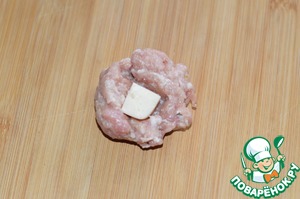 • Сыр нарезать небольшими кубиками. Полоски бекона разрезать вдоль на 2 половинки. Так проще будет обматывать наши митболы.