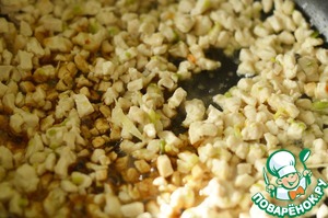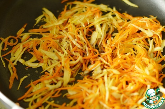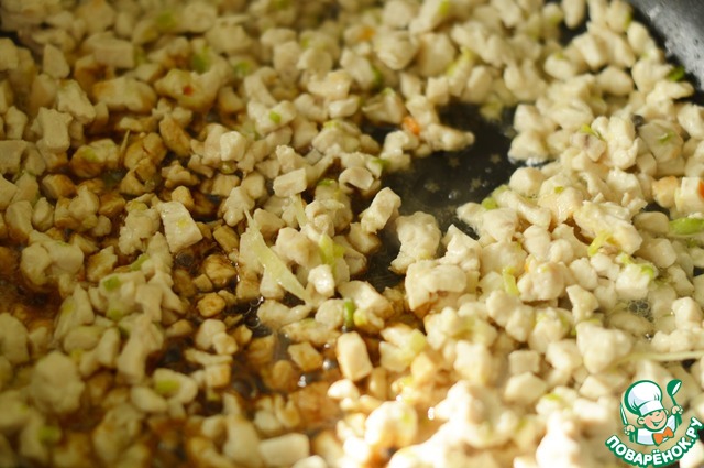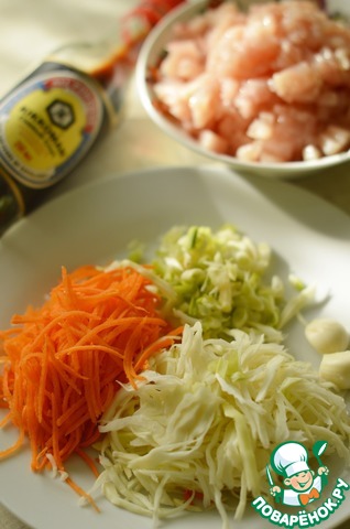 Филе нарезать мелким кубиком. Морковь и капусту нашинковать соломкой. Лук нарезать колечками. Чеснок измельчить.