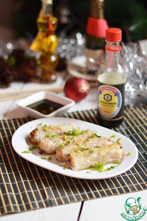 Еще один вариант вкусной закуски. Старайтесь. чтобы рисовая бумага не была порвана, и ролл был герметично завернут, иначе раскаленное масло попадет внутрь, и пар взорвет ролл изнутри. Начинку нужно аккуратно выкладывать на край листа, отступая 3-4 сантиметра, заворачивать снизу, затем накрыть середину боковыми частями, и туго скрутить в ролл.