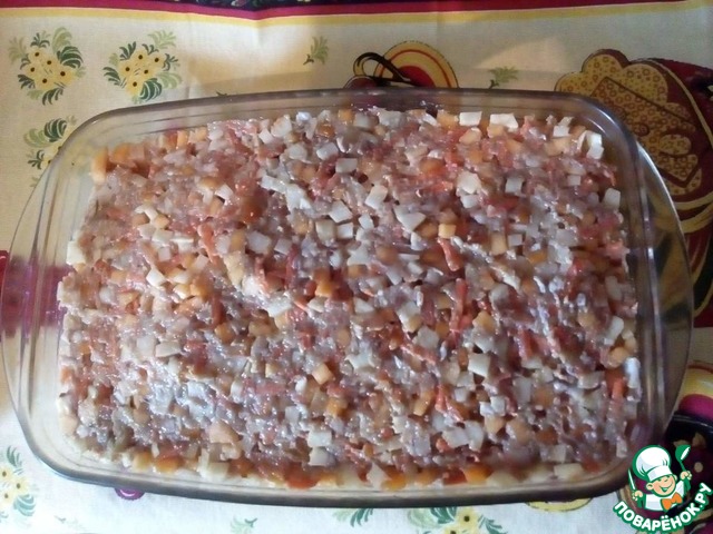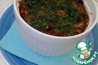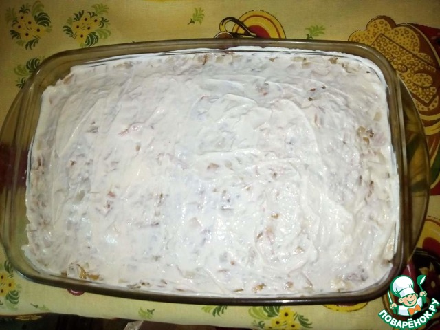• Сверху смазать майонезом, можно посыпать сыром. Разогреть духовку, поставить противень на 40-50 минут и запекать при температуре 180 градусов.