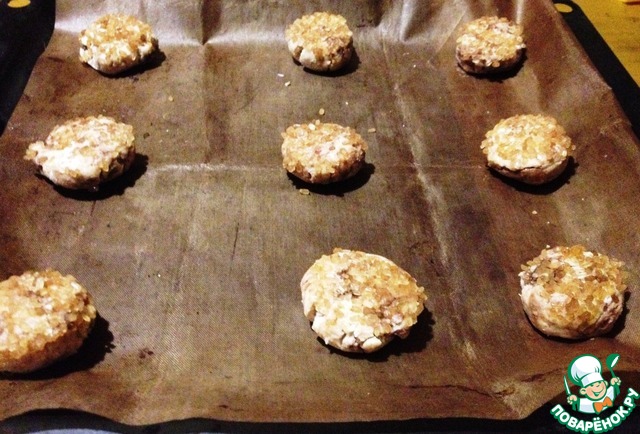 Из теста скатать шарики величиной с грецкий орех, положить в блюдце с сахаром и немного приплюснуть. -