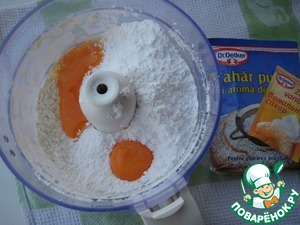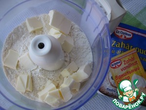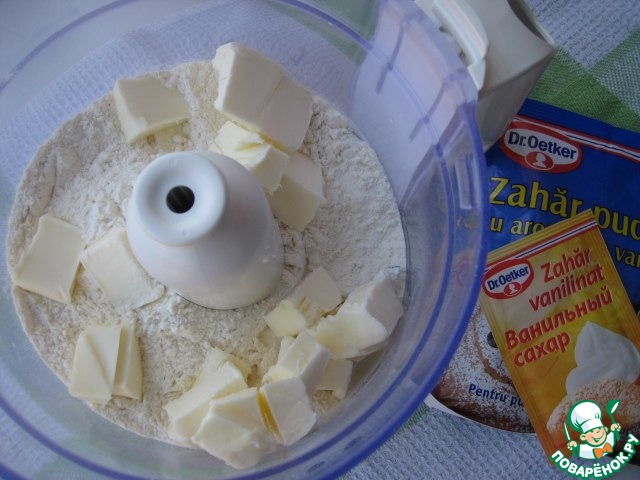 Приготовить песочное тесто: я готовлю в кухонном комбайне насадкой нож. Порубить муку с холодным сливочным маслом.