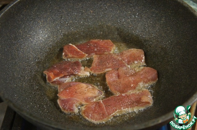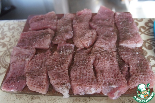 • Свинину нарезать порционными кусками и отбить, посолить и поперчить.