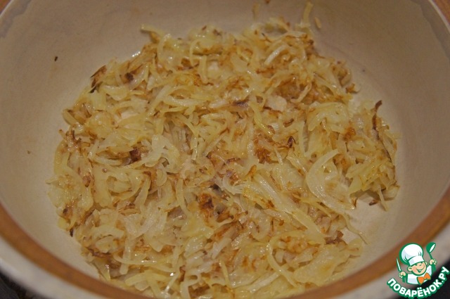 • На дно кастрюли выложить нарезанный и обжаренный лук.
