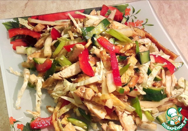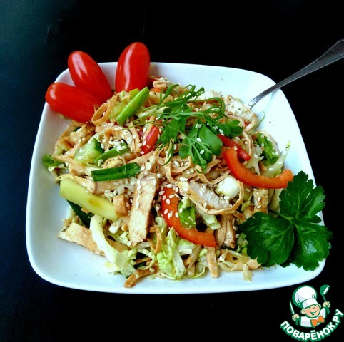 Джейми Оливер называет подобные азиатские закуски "Салат из вчерашнего цыпленка", это когда остался кусочек от вчерашнего ужина и добавляя к нему разные овощи, зелень и компоненты заправки получается свежее овощное блюдо, но с сытными компонентами. Я люблю такие салаты и на праздничный стол, чтоб побольше овощей было, так как застолья у нас всегда обильные