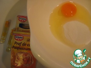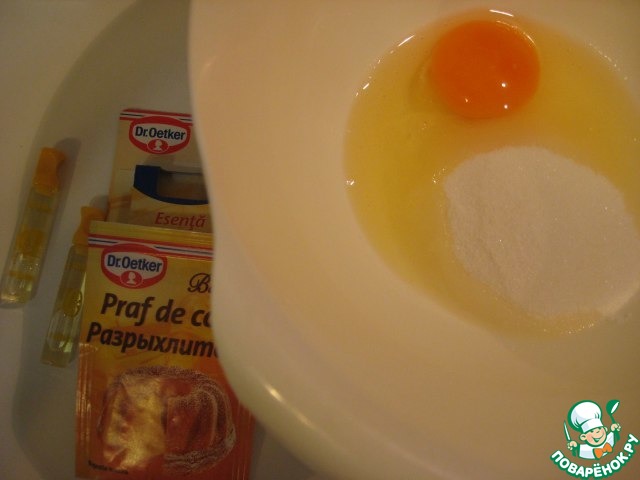 В глубокой чаше взбить яйцо с сахаром и ванильной эссенцией. -