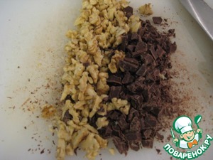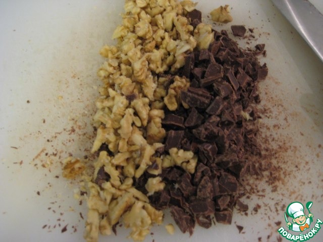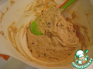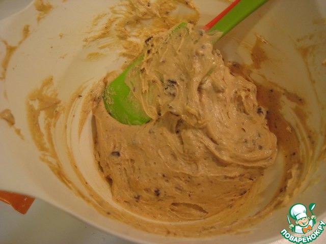 Добавить мягкое сливочное масло, взбить, влить крепкий холодный кофе, перемешать. Добавить муку с разрыхлителем, перемешать, вмешать шоколад и орехи.