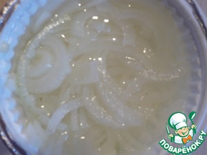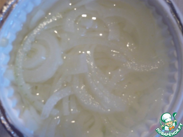 Лук режем на полоски, заливаем уксусом и добавляем 1 ч. л. сахара.