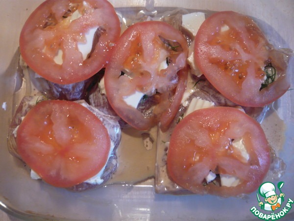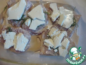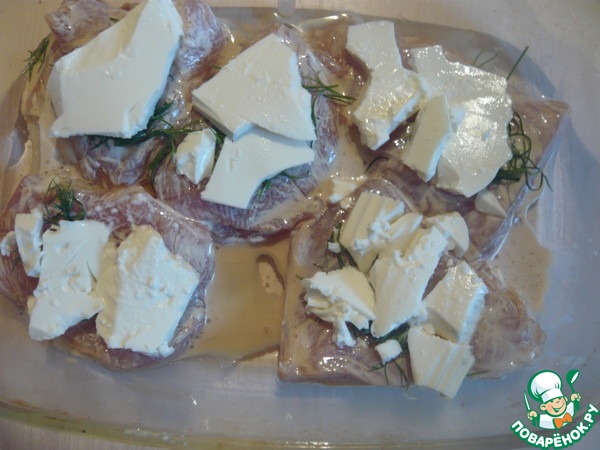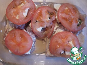 Форму смазываем растительным маслом, выкладываем филе. На филе кладем ломтики сыра.