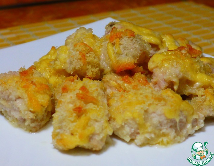 Каждый кусочек куриного филе обвалять сначала в масле с чесноком, а затем в сухарях с сыром.