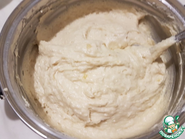 Добавляем бананы измельченные, перемешиваем миксером. Всыпаем муку с разрыхлителем и все перемешиваем лопаткой. Получается густое тесто.