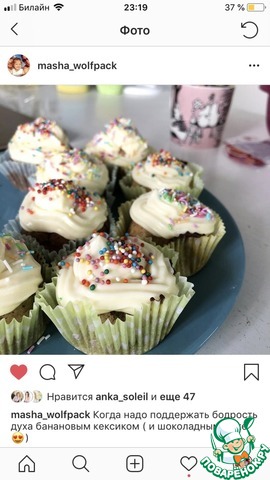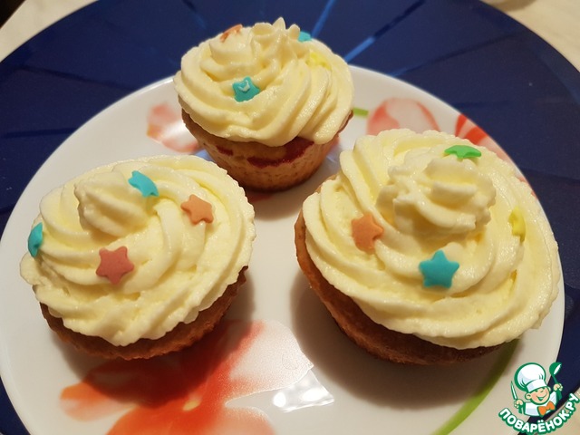 Пока выпекаются и остывают, делаем крем. Взбиваем сливочный сыр с сахаром, добавляем сливочное масло и продолжаем взбивать. Делаем шапочки на капкейках. Красиво получается, если украсить посыпкой «Dr. Oetker».