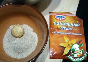 Достаем тесто из холодильника и, отламывая от него кусочки, скатываем шарики трех размеров. Вес самого маленького примерно 10-15 г, среднего 20-25 г, большого - 30-35 г (можно сделать все и на глаз, но так точнее). Затем шарики обваливаем в ванильном сахаре.