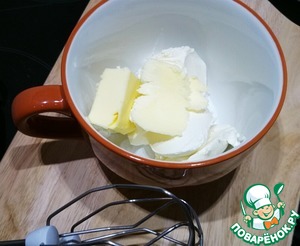 Крем готовится следующим образом. Соединяем сливочное масло со сливочным сыром.