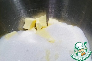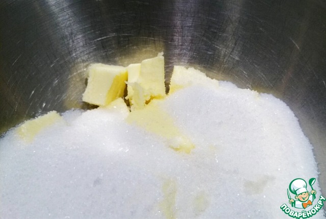 Сначала готовим тесто для печенья. Растираем масло с сахаром.