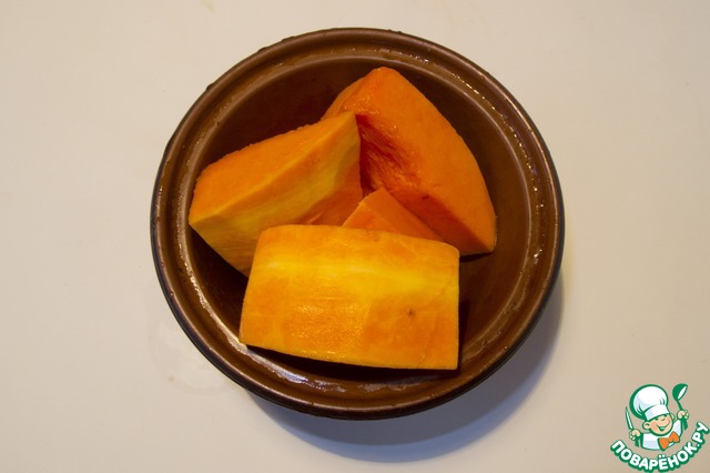 1. Включаем духовку на 180 градусов и пока она греется подготавливаем тыкву к запеканию. Очищаем от кожуры, семян, прожилок, режем крупными кусками. Складываем овощ в жаропрочную емкость с крышкой. Если крышки нет, с ее функцией прекрасно справится фольга. Запекаем горшочек с тыквой в духовке до мягкости. У меня на это ушло 30 минут