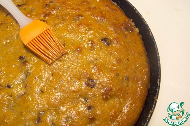 8. Готовый манник накрываем полотенцем и сразу же ставим сотейник с будущей пропиткой на средний огонь. Пока она закипает, спичкой или зубочисткой густо-густо протыкаем манник (из формы не доставать). Закипевшую заливку выливаем на манник. Сначала она будет покрывать его довольно толстым слоем, но постепенно впитается