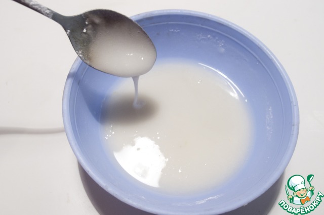 9. Готовим глазурь для заливки. Для этого смешиваем 2 ч. л. лимонного сока и 12 ч. л. сахарной пудры. Если масса получится густой, нетекучей – добавляем капельку воды, если слишком жидкой – пудры. Общее количество требуемой глазури будет очень зависеть от вашей формы. Чем больше площадь, тем больше ее понадобится. У меня ушла полуторная порция