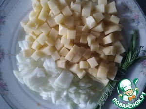 За это время чистим лук и картошку. Лук мелко режем, картошку-небольшим кубиком. У меня был небольшой пучок петрушки. Веточки я связала для бульона, зелень будем добавлять в конце. В оригинале в бульон добавляется корень петрушки.