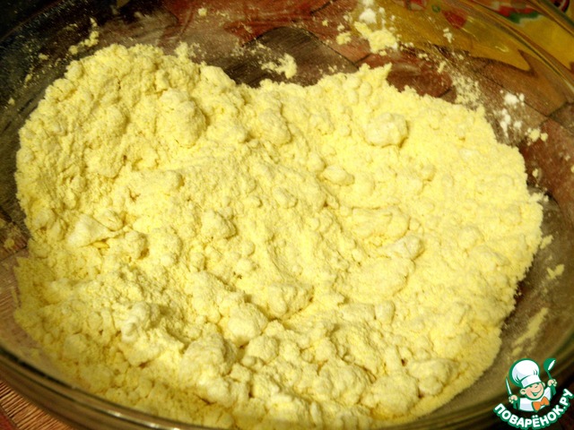 Муку смешать с разрыхлителем, сахаром и солью. Холодное масло нарезать кусочками и перетереть с мукой в крошку. Добавить творог и перемешать.