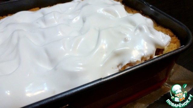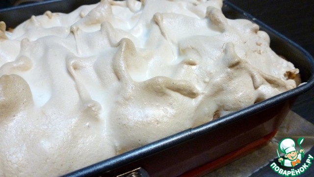 • Основа пирога запеклась. Выкладываем на дно натертую айву, сверху - взбитые белки. Сформируем из взбитых белков для красоты волны или пики.