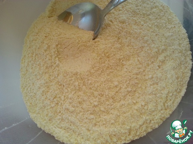 Муку просеять, смешать с разрыхлителем и манной крупой.