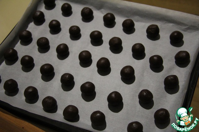 Застелить противень бумагой для выпечки и укладывать заготовки, размером с грецкий орех. Тесто невероятно приятное в формовке!!!