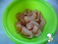 Нарезать куриную грудку вдоль, тонкими брусочками.