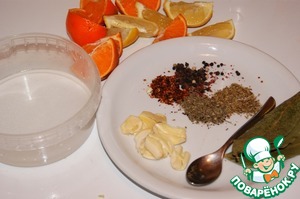 Соль залить небольшим количеством теплой воды и растворить. Апельсин и лимон нарезать на 4-6 частей. Чеснок раздавить. -