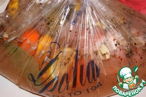 Можно замариновать мясо в контейнере, но у меня большой кусок, чтобы не занимать много места в холодильнике, я поместила мясо с маринадом в плотный пищевой мешок.