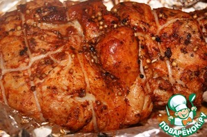 Плотно обернуть фольгой и запекать в прогретой до 190-200"С духовке около двух часов. Проколоть мясо прямо через фольгу, если нож легко входит в него, а выделившийся сок светлый - мясо готово. За 10-15 минут до готовности открыть фольгу и дать мясу зарумяниться.