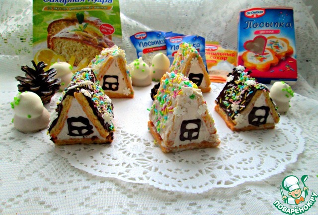 Так же из растопленного шоколада кондитерским шприцем нарисовать окошки, крыши посыпать посыпками.