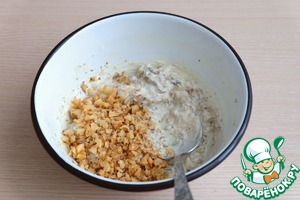 • Грецкие орехи (1/2 стакана) промыть в 2-3 водах, обсушить бумажным полотенцем, слегка обжарить. Порубить орехи в мелкую крошку.