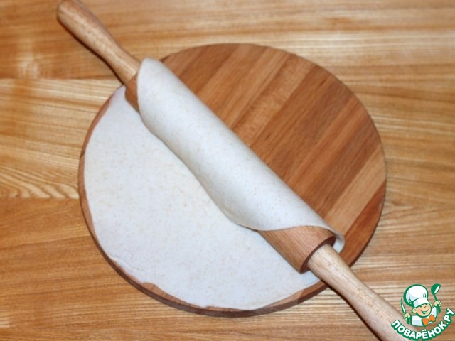 10. Раскатываем вторую часть теста 70 гр = Ф 22 см, переносим и кладем на первый круг, смазываем маслом.