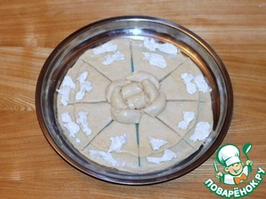 С остальными частями теста проделываем тоже самое. Получается 3 заготовки пирога. Ставим противень с пирогами в духовку. Включаем min t 40 C и оставляем пироги минут на 15-20 в духовке до увеличения в 2 раза.